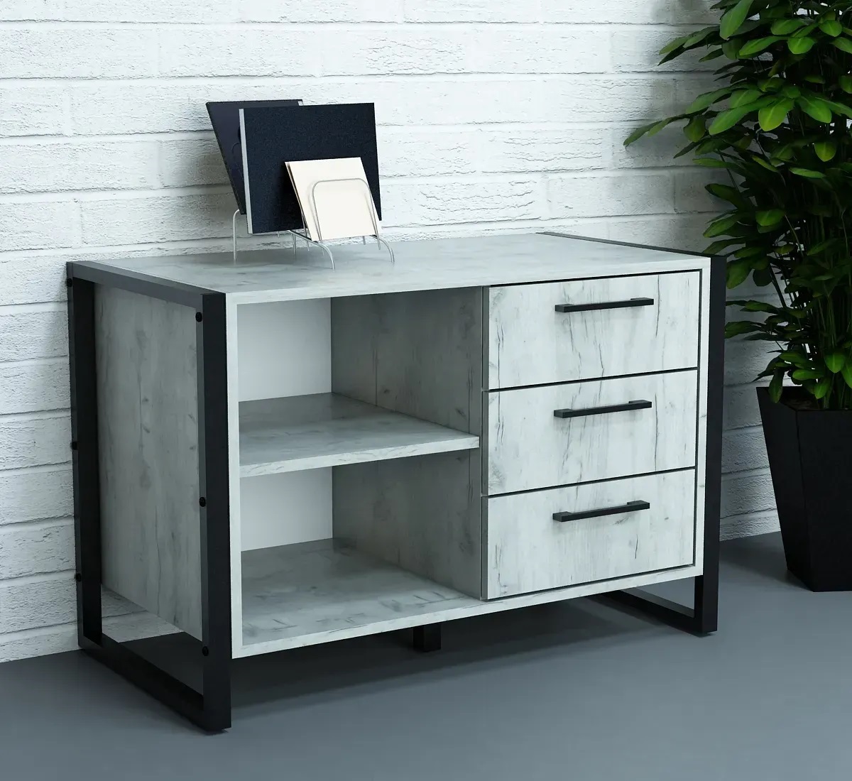 Комбінована офісна тумба хороша тим, що не змушує обирати щось одне. В одному корпусі поєднуються відкриті полиці, висувні шухляди й закриті секції, тому частину речей можна тримати під рукою, частину прибрати з очей, а частину взагалі закрити. У реальній роботі це зручно більше, ніж здається на фото в каталозі.